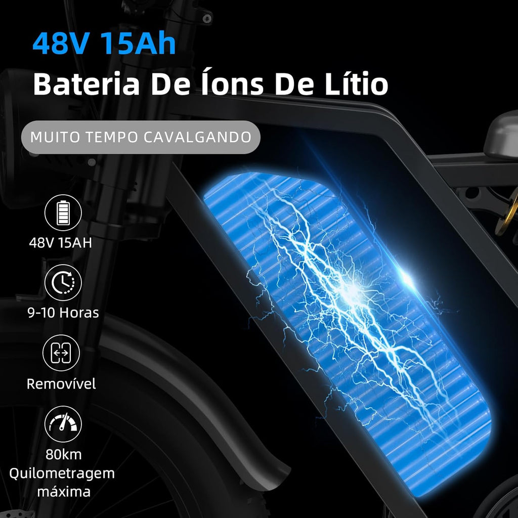 Equipada com uma bateria 48V 15Ah, certificada pela UL, garantindo segurança e qualidade.